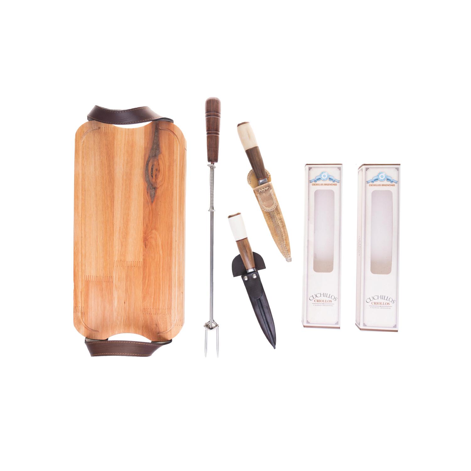 Combo Exclusivo 1 Cuchillo Inox14 Cm En En Hueso Y Madera Con Vaina De Cuero Crudo CUC124 1 Cuchillo Regional Inox14 Cm Con Vaina 208 Grabado CCaja 1 Tenedor Inox 1 Tabla con 2 Manija de Cuero 40×20