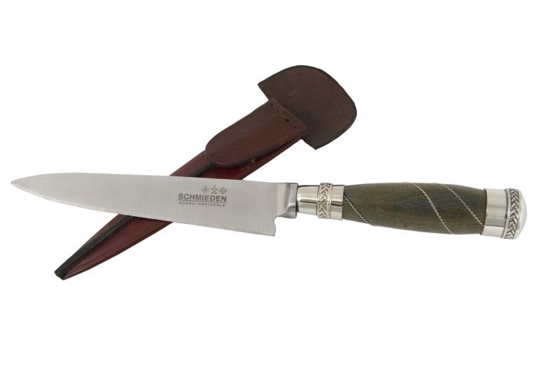 Cuchillo Hoja Acero Inox Schmieden 14 Cm Encabado En Madera Palo Santo Con Copas y Alambre Doble En Alpaca y Vaina De Cuero Vaqueta