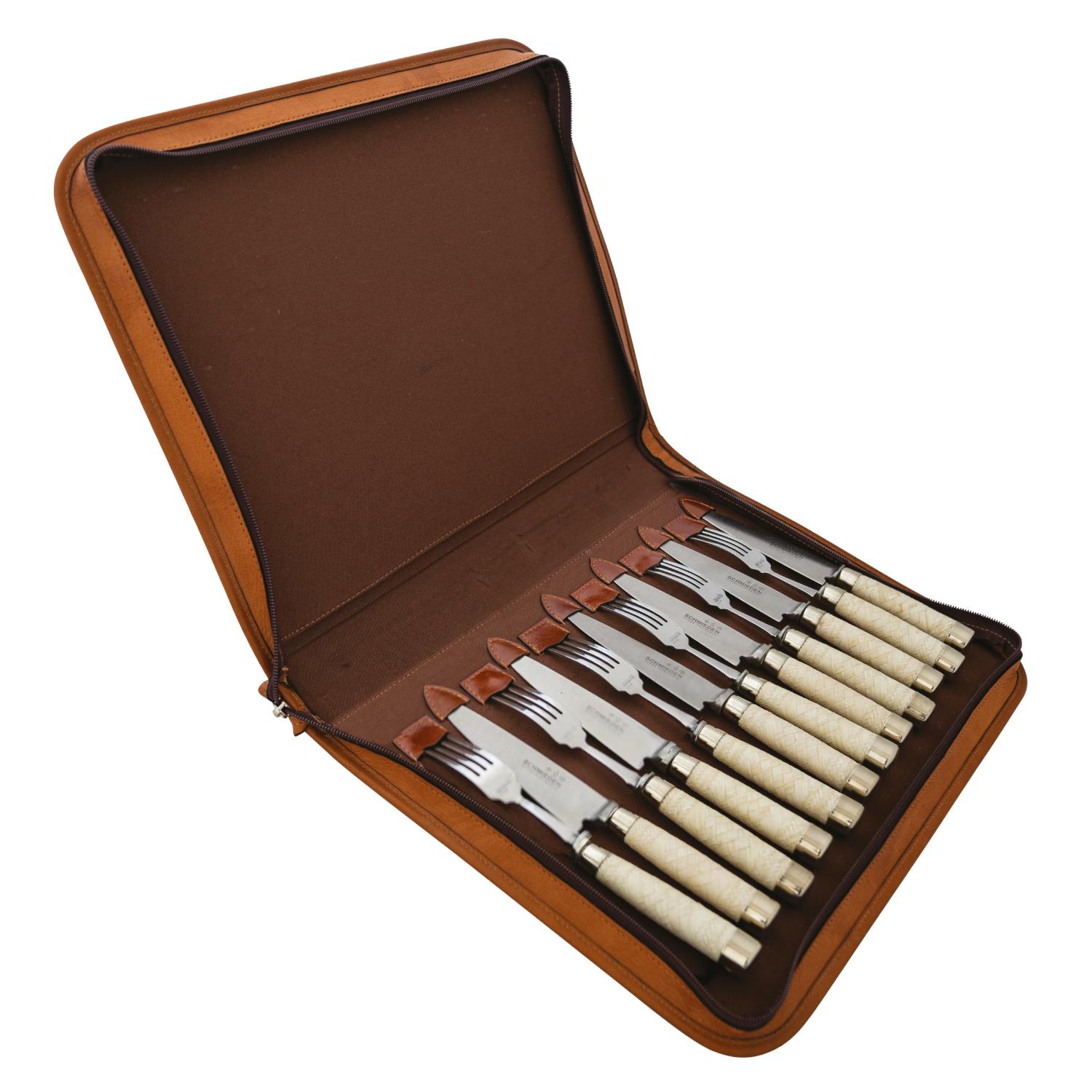 Juego De Tenedores y Cuchillos En Acero Inoxidable Por 12 Unidades Encabados en Trenzado Claro Con Virolas De Alpaca Con Estuche En Cuero Claro simple