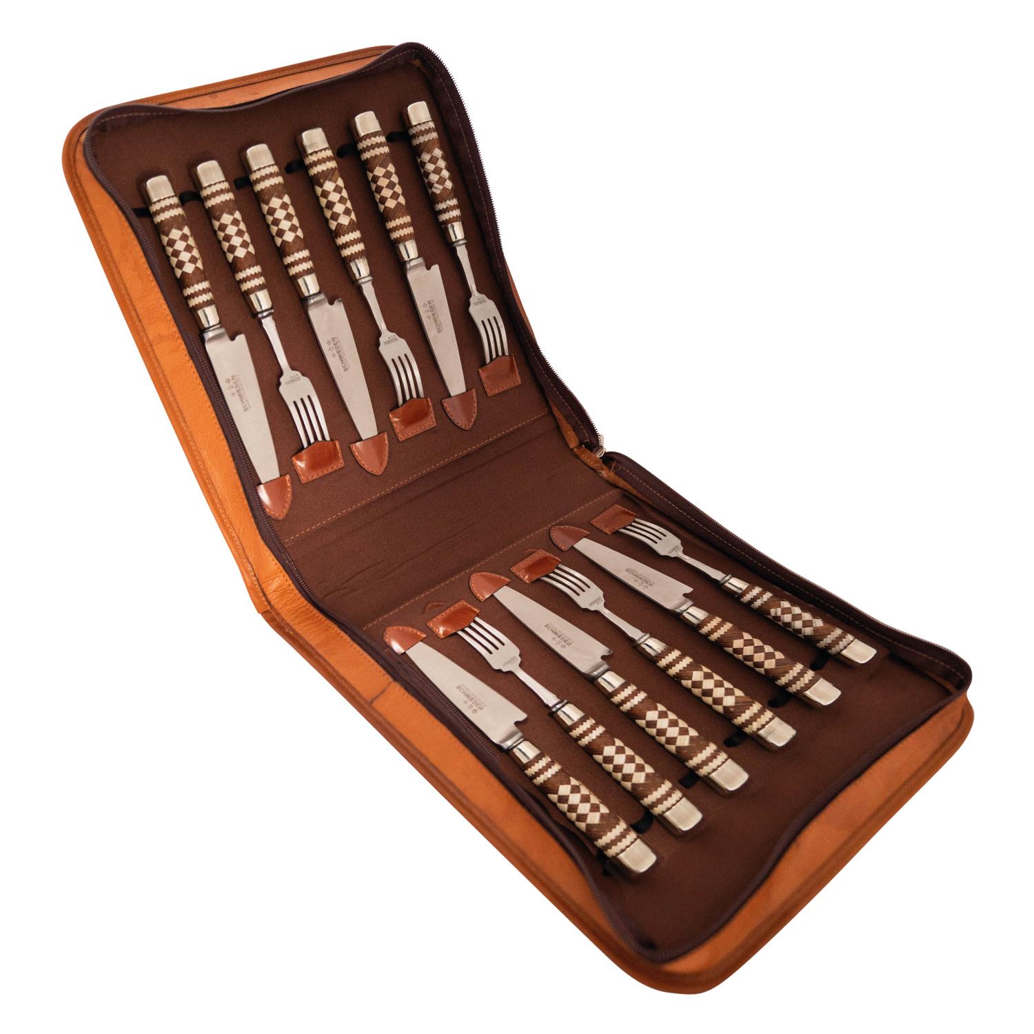 Juego De Tenedores y Cuchillos En Acero Inoxidable Por 12 Unidades Cabos Trenzados Varios Modelos En Estuche En Cuero Claro